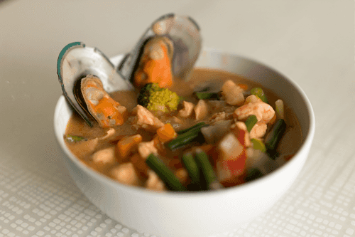 Thick tomato soup with salmon, tiger prawns and mussels