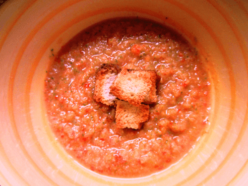Serve gazpacho chilled with avocado cubes, a drizzle of olive oil, and grated Manchego cheese.