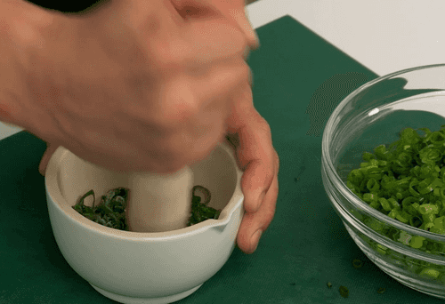 Sprinkle salt on a part of the onion and crush it.