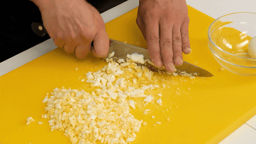Boil the eggs hard, rinse under cold water, peel, and chop finely.