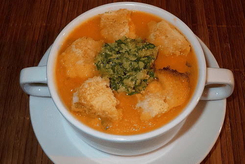 Pour the soup into bowls, add croutons, and place a spoonful of olive oil in each. Drizzle with olive oil.