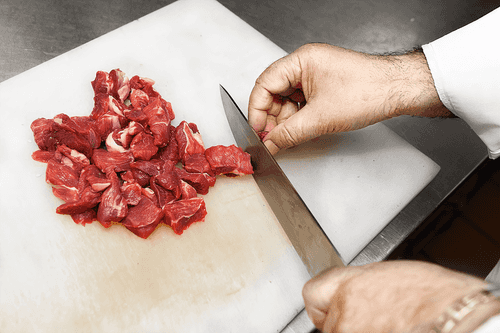Meanwhile, clean and chop the onion, sweet pepper, tomatoes, beans, celery stalks, and garlic into fairly large pieces. Cut the lamb (meat) into medium-sized cubes. Heat two tablespoons of vegetable oil in a pot and cook the meat until a crispy crust forms.
