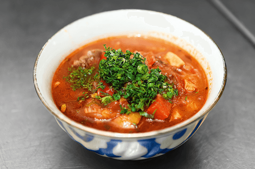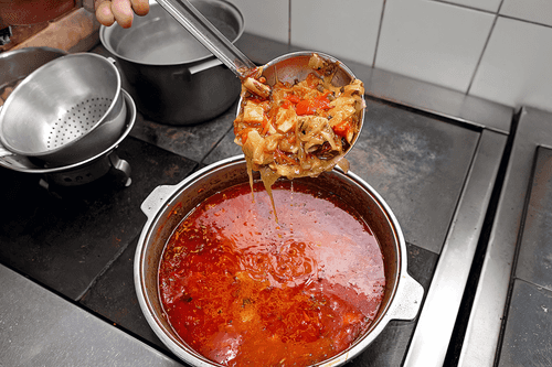 Add onion to the meat, then tomatoes a little later, garlic, celery stalks, tomato paste, and spices (except paprika) after five minutes. Simmer for one and a half to two hours. Fifteen minutes before the end, add sweet pepper, beans, and paprika, and five minutes before the end, add celery greens. Dilute the sauce with water or meat broth to the desired consistency, salt it, and bring to a boil while stirring.