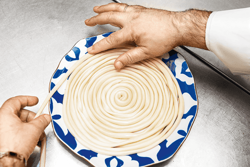 Divide the dough into several pieces. For each piece, grease with vegetable oil, knead by hand and roll it into a strand. When it becomes thin enough, gradually stretch it further by passing it between your fingers first one way and then the other. Then place the dough in a spiral on a plate and let it rest for another ten minutes.