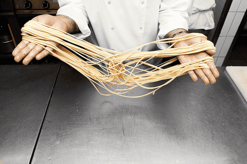 Carefully, calculating the strength to avoid tearing the noodles, spread your arms and occasionally slap the table — so that the noodles' thickness approaches spaghetti as much as possible.