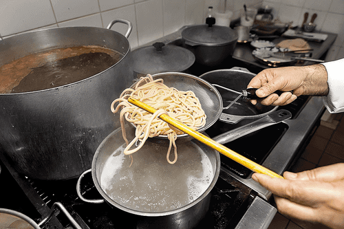 Place the noodles in a strainer, dip into boiling salted water, cook for two to three minutes, then remove and rinse with cold running water. Divide the noodles into portions.
