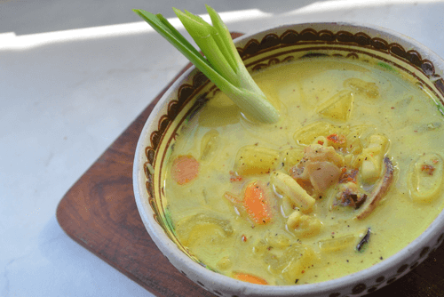 Transfer the vegetables with seafood to boiling water. Add coconut milk, juice of half a lemon, and spices to taste.