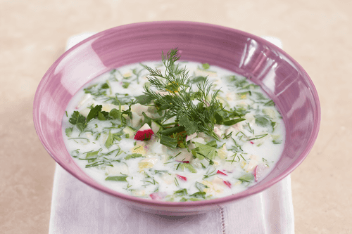 Okroshka with kefir and chicken is a refreshing dish of Russian cuisine, perfect for a hot summer day. The origins of okroshka date back centuries when peasants made light yet nutritious cold soups based on kvass. Over time, variations emerged, including a milder version with kefir. The delicate combination of chicken, crunchy cucumbers, and radishes gives the dish a fresh, slightly spicy flavor, while herbs and rice vinegar add a light tanginess. Sparkling water makes the consistency light and airy, turning okroshka into a refined gastronomic delight. Served chilled and garnished with a sprig of dill, it refreshes and invigorates while remaining a versatile addition to the summer table.