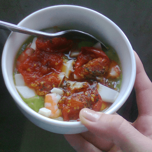 Serve the soup: first zucchini puree, then add shrimp on top, followed by roasted cherry tomatoes, and finally unevenly broken pieces of goat cheese.