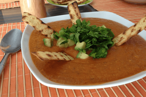 Tomato soup with tortilla, pumpkin and avocado
