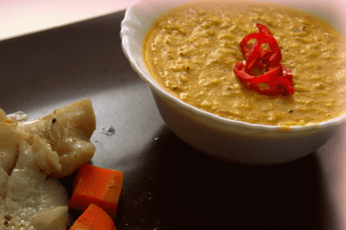 Serve, garnished with thin slices of red chili pepper on top.