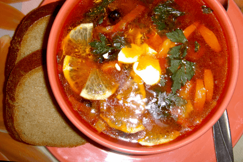 Pour the ready solyanka into plates, add greens, lemon, garlic, and sour cream.