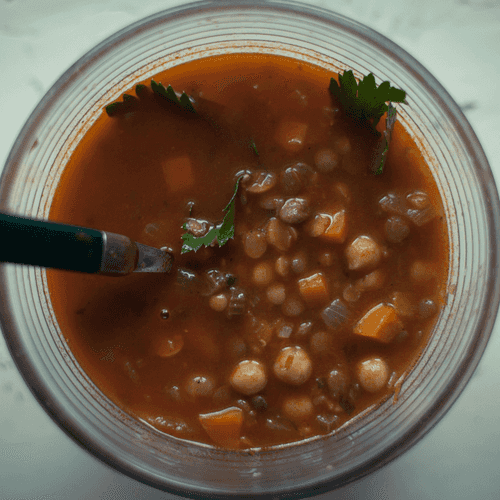 Tomato soup with five types of legumes is a rich and nutritious dish infused with the spirit of traditional European cuisine. Its history begins in simple village recipes where legumes were used to add heartiness and depth of flavor. In this soup, beans, chickpeas, lentils, and peas come together to create a rich textural ensemble, while tomatoes add a sweet-sour note. The aromas of celery, bay leaves, and black pepper enhance the flavor harmony. This soup is perfect for a cozy family dinner or a warming lunch in cold weather. With its high protein and fiber content, it satisfies well and supports energy levels. Served hot with crusty bread or herbs that highlight its natural freshness.