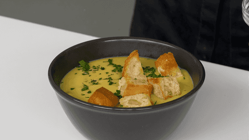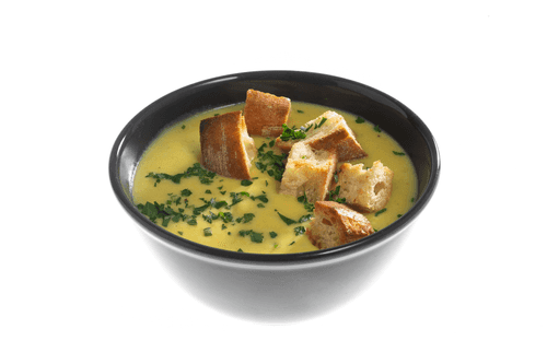 Add hot cream and broth to the soup to the desired consistency, season with salt and pepper to taste, and heat while stirring.