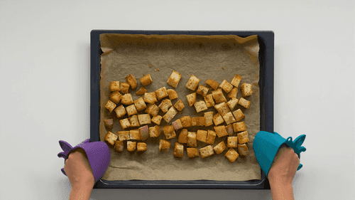 Cut the bread into large cubes, place on a baking sheet, salt and drizzle with oil. Bake in an oven preheated to 220 degrees until golden brown for 7-10 minutes.