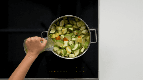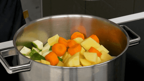 Peel and chop zucchini, potatoes, carrots, and onions randomly.