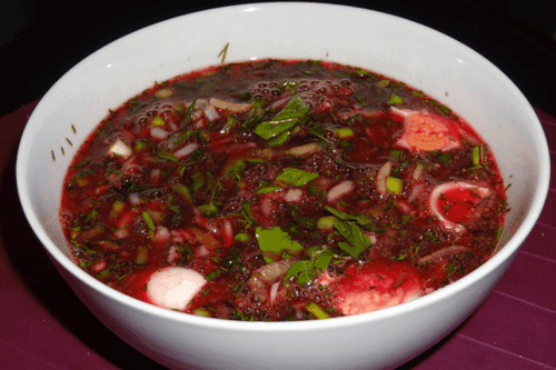Place in serving plates, pour with beet kvass infusion, and add one quail egg to each plate.
