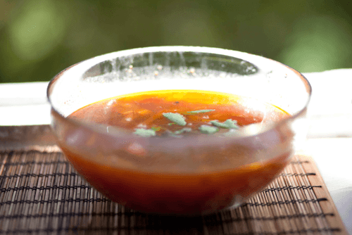 We serve with a bowl of chopped cilantro, parsley, red basil, and ideally, tarragon, drizzled with lemon juice.