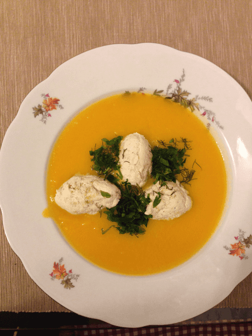 Pumpkin cream soup with chicken dumplings is a cozy, tender, and warming dish that combines the velvety texture of pumpkin puree with juicy chicken dumplings. The natural sweetness of pumpkin harmonizes with the mild spiciness of ginger and the aroma of saffron, while vegetable broth adds depth of flavor. Chicken dumplings bring softness and a pleasant meaty note. This soup comes from European cuisine, where the balance of flavors and textures is appreciated. It is perfect for cool evenings, filling the home with warmth and comfort. It can be served with croutons or fresh bread to highlight its creamy consistency and rich flavor. Light yet nutritious, this soup will become a family favorite.