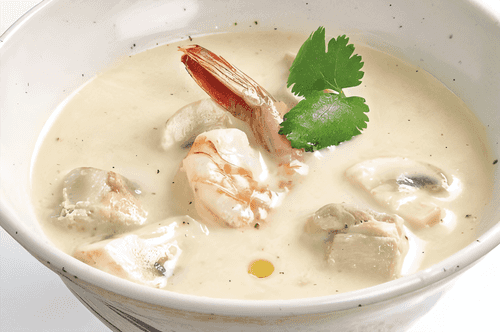 Tom Kha Kung is an exquisite Thai soup that embodies the rich flavors of Southeast Asia. Its delicate coconut base harmonizes with the spiciness of tom yum paste, the aroma of galangal, and the freshness of lemongrass. This dish is a true symphony of flavors: the sweetness of coconut milk, the tartness of lime and tom yum, the heat of chili, and the depth of umami from shiitake mushrooms and shrimp. Tom Kha Kung historically emerged in Thailand as a milder alternative to spicy tom yum and is now one of the most popular soups in Thai cuisine.