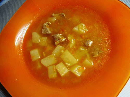 Soup with boiled-smoked pork belly and millet is a warming and aromatic dish that embodies the traditions of European cuisine. The boiled-smoked belly gives the dish a rich, slightly smoky flavor that pairs wonderfully with the softness of millet and the tenderness of potatoes. The light acidity of tomato paste adds depth to the taste, while sautéed vegetables fill the soup with appetizing sweetness. This dish is perfect for cold weather when you're craving something nourishing and cozy. It is served with dill, which provides a fresh herbal aroma, and black bread that complements the flavor palette. Such soup is not just food but a true gastronomic journey into a cozy home atmosphere.