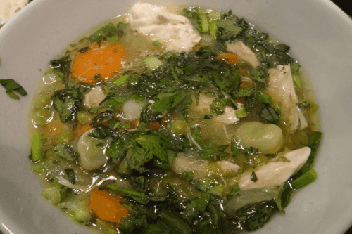 Pour the soup into bowls and sprinkle with greens. Note — if you cook the soup in the evening, be prepared for the peas and beans to lose their green color.