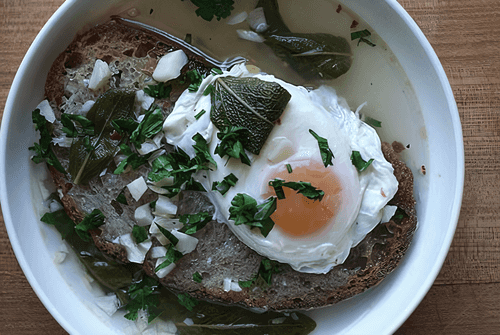 Before serving, place a piece of toast with a poached egg on top at each bowl of soup.