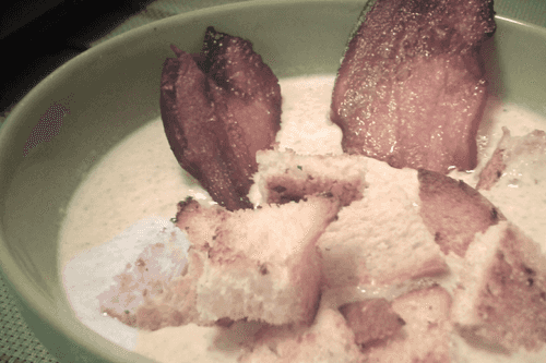 Pour the cream soup, add croutons before serving, and top with bacon chips.