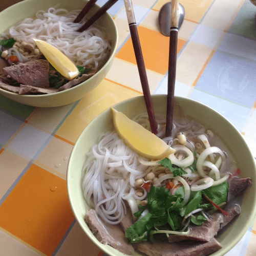 Cook a spicy beef broth. I added lemongrass, a whole onion, chili pepper (a few pods), black peppercorns, salt, and bay leaves.