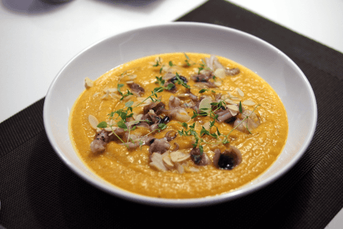 Pumpkin soup with seafood is a delicate and warming dish inspired by European culinary traditions. Its origins trace back to medieval gastronomy when pumpkin was a popular ingredient due to its nutrition and mild flavor. Roasted pumpkin and carrots add richness and a light sweetness to the soup, harmoniously complemented by the citrus freshness of orange juice and the subtle spiciness of ginger. Shrimp added before serving gives the soup notes of sophistication, while crunchy almond petals or pumpkin seeds provide a pleasant texture. This soup is perfect for cozy autumn evenings and as an elegant dish for special occasions, highlighting the richness of flavors and aromas.