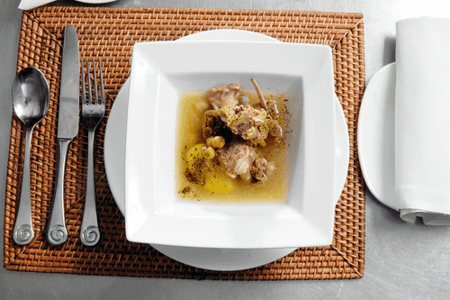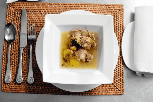 After three hours, add chickpeas to the soup (you can also use dry chickpeas, but then add them at the very beginning when the broth boils) — and wait another five hours. Twenty minutes before it's ready, add a potato to the pot. Finally, after seasoning with salt and pepper, pour in a tablespoon of saffron infusion (which is made simply: soak 1 gram of saffron in 250 ml of warm water for one and a half hours).