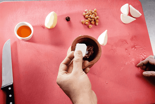 Preparing to cook piti starts with soaking chickpeas — they should be left in water overnight. Just before making the soup, ingredients need to be prepared: cut a quarter of an onion, clean and chop the meat — flesh, brisket, shoulder, neck, ribs (50 g each). It's important that it comes from different parts of the carcass: brisket adds fat to the broth, while neck and shoulder enhance the flavor.