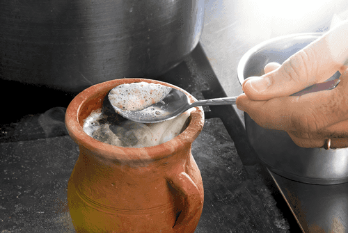 Place pieces of meat, lamb fat, dried plums, and onion in a tall and narrow clay pot. Fill with water — almost to the top, leaving about a centimeter. Put on high heat and bring to a boil.
