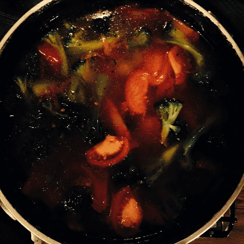 Remove the cooked chicken from the broth. Add broccoli, potatoes (cut potatoes into cubes, cut broccoli into small pieces), sautéed onion and carrot mixture, and tomatoes (cut tomatoes into wedges) to the broth. Cook the vegetables for 15-20 minutes. Add salt and pepper.