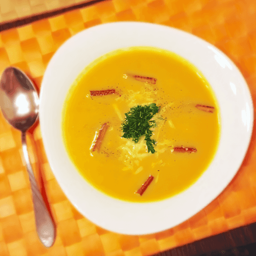 Pumpkin soup with ginger and cream is the embodiment of coziness and warmth in European cuisine. Historically, pumpkin has been popular in cooking due to its sweet flesh and rich flavor, while the combination with spicy ginger and delicate cream creates a harmony of exquisite aroma and velvety texture. Sautéed onions and garlic add depth to the dish, while the addition of curry enhances the color, giving the soup a sunny hue. This soup is perfect for cool weather: it warms you up and fills you with energy. Serve it with crispy croutons or pumpkin seeds for added textural contrast. It not only delights the taste but also brings health benefits—pumpkin is rich in vitamins, ginger boosts immunity, and cream adds softness. This dish lifts your spirits and wraps you in comfort!