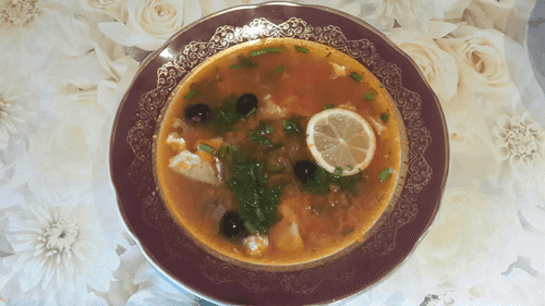 Fish solyanka is a fragrant and rich soup with roots in Russian cuisine. Its bright flavor comes from the contrast of salty, spicy, and sour notes: tender fish combines with piquant olives, pickles, and tomato paste. The dish gained popularity due to its ease of preparation and rich aroma. It is especially pleasant to serve solyanka with lemon, which highlights its freshness and adds a subtle sourness. This soup is often prepared for festive gatherings or cozy family lunches. Fish solyanka is perfect for warming up in cool weather and pairs well with rye bread.