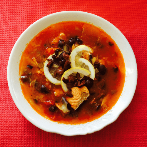 Fish solyanka made from three types of salmon is a rich, aromatic dish of Russian cuisine that combines the tenderness of fresh fish with the spiciness of smoked meats and a light salty sharpness from cucumber brine and capers. This soup is known for its rich texture and complex flavor balance achieved by combining chinook salmon, hot-smoked pink salmon, and lightly salted salmon. The roots of the recipe trace back to the traditions of old Russian taverns where solyankas were prepared as hearty warming food. The aroma of sautéed onions, tomatoes, and spices combined with a hint of lemon makes solyanka particularly appetizing. It is served hot with lemon slices that further enhance its multifaceted taste. A wonderful choice for lovers of rich fish dishes!