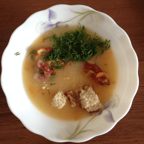 Pea puree soup with smoked wings is a traditional Russian dish filled with warmth and the rich aroma of smoked foods. Its origins go deep into history when pea soups were popular among peasants due to the availability of ingredients and their nutritional properties. The thick, velvety texture of peas harmonizes with the softness of potatoes, while sautéed vegetables add a light sweetness. The smoked wings give the soup a rich, spicy flavor, making it especially warming. This soup is perfect for cold weather, restoring strength and providing a sense of fullness. It is served with fresh dill and crispy croutons that add an interesting textural play. Simple to prepare yet surprisingly rich in taste, it makes an excellent choice for a cozy home dinner.