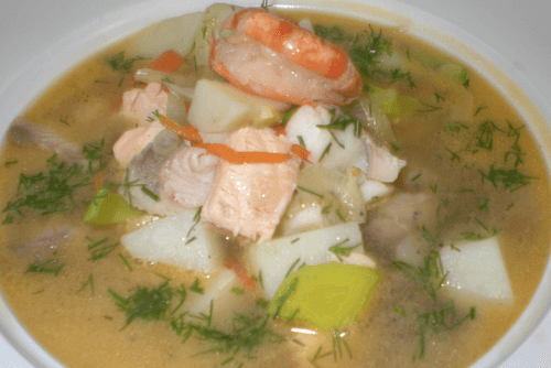 Uha 'Tsarskaya' (Morella) is an exquisite dish of Russian cuisine worthy of a royal table. This rich soup combines the tenderness of seafood with the depth of chicken broth. Tiger shrimp, salmon, and dorado create a delicate and rich flavor, while potatoes and fresh vegetables add softness and balance. A light tang from lemon refreshes the dish, and herbs provide brightness and freshness. Grilled vegetables - leek, zucchini, and bell pepper - highlight the noble character of the dish. The uha is aromatic, warming, and nourishing, perfect for both festive gatherings and cozy family dinners. This recipe embodies the traditions of Russian gastronomy with an exquisite modern twist.