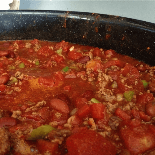 Add the fried minced meat, chopped canned tomatoes, canned beans, spices, sugar, salt, ground peppers, tomato juice, and water to the saucepan.