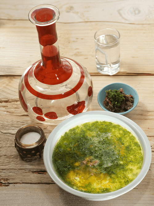 Remove the meat from the prepared broth. Strain the broth, chop the meat into small pieces, and add it to the kidneys. Add half of the chopped dill and sauté for two minutes. Transfer the entire mixture to the broth, bring to a boil, and cook for ten minutes.