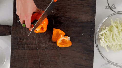 Grate the carrot, chop the onion into small cubes, and fry until golden. Add to the pot along with the chopped pepper.