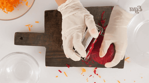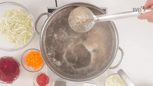 Grate the beetroot, fry for 10 minutes, add tomato paste, cover with a lid and simmer for another 20 minutes. Add to the borscht 10 minutes after the potatoes. Cook for another 10 minutes.