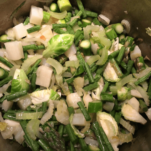 Add diced potatoes, 2/3 of the asparagus, green beans, and grated Parmesan, and simmer for about 5 minutes.