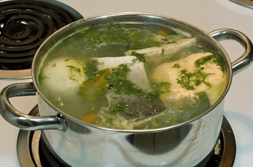 Let it steep for 5 minutes. Place a slice of lemon in a bowl and pour the fish soup.