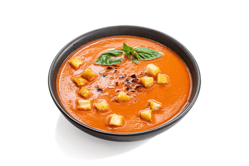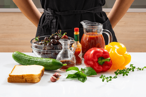 Pour the gazpacho into deep bowls, sprinkle each serving with croutons, crushed cherries, and garnish with basil.