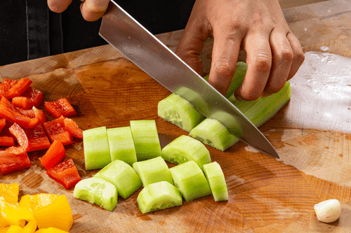 Chop the second clove of garlic, remove the seeds from the sweet pepper, peel the cucumber and also remove the seeds, then cut both into small cubes.