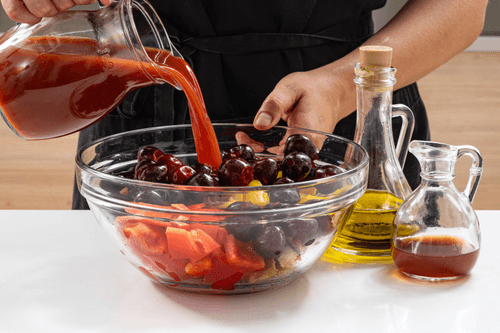 Pour in tomato juice, vinegar, and 60 ml of olive oil. Add salt and pepper, and let it sit at room temperature for 2 hours.