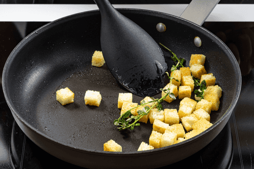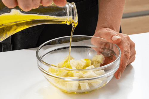 Cut the crust off the second slice of bread, dice it, and mix with the remaining olive oil.