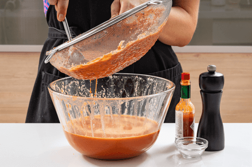 Blend the mixture of vegetables and berries into a puree, strain through a sieve, season with salt, pepper, and add Tabasco to taste.